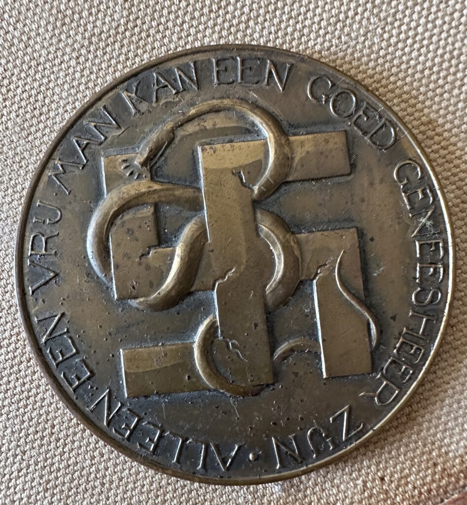 Herdenkingspenning uitgegeven door de Nederlandse Maatschappij tot Bevordering van de Geneeskunde in 1946.