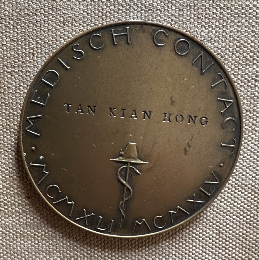 Kz: Esculaap waarboven de gravering; ‘Tan Kian Hong’; Omschrift: ‘Medisch Contact’, en de jaartallen 1941-1945. Brons, 60 mm. (Geslagen bij ’s Rijksmunt).
