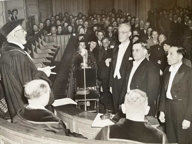 Al eerder zag ik een van de foto’s waar pa Hong in rok in staat samen met oom Kees van Raalten (linksonder). De gelegenheid was mij onbekend. Nu het fotoboek van de promotie teruggevonden. Weer een klein puzzelstukje opgelost.